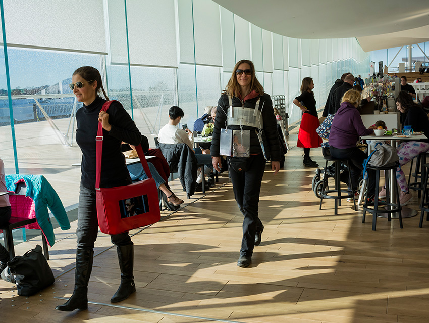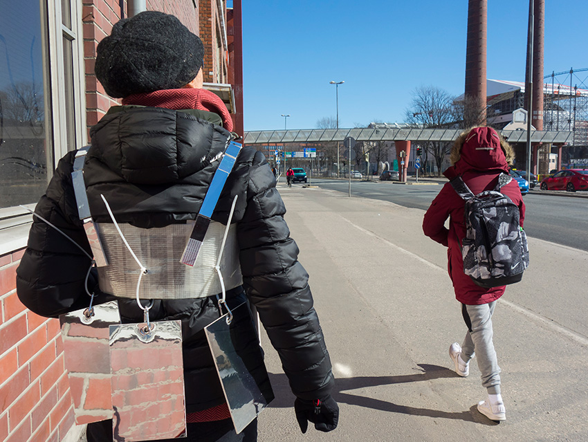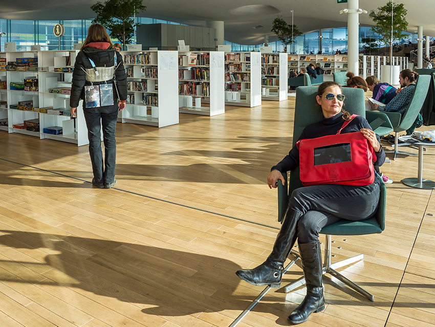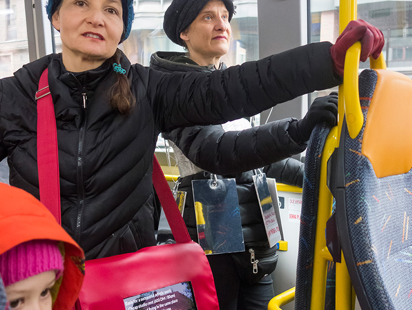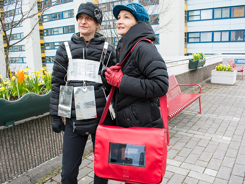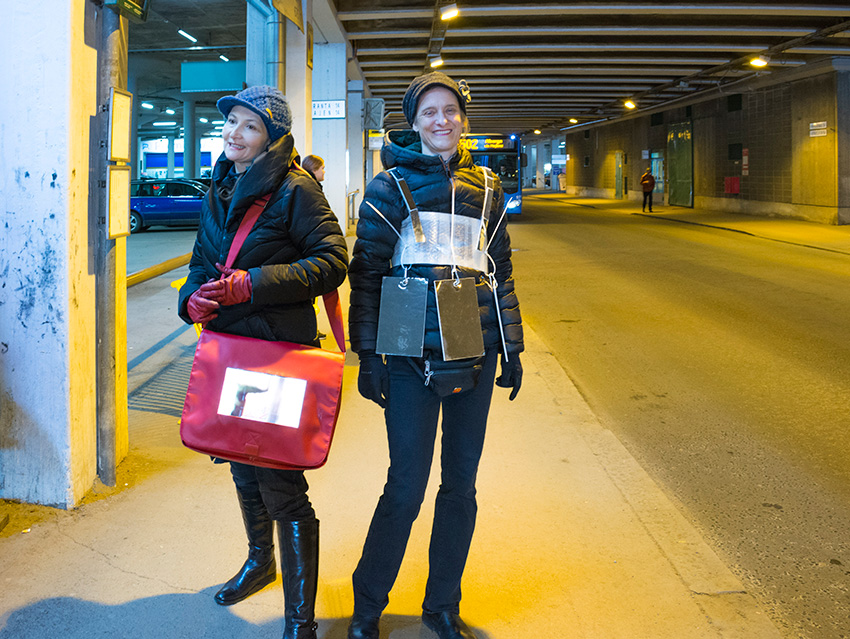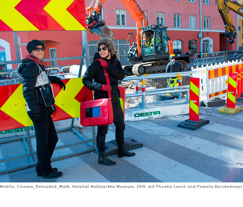 Das Projekt „Mobile Cinema Reloaded“ sieht vor Künstler aus Deuschland auszusuchen, die dann in Helsinki und in Rom im Macro_asilo (www.museomacro.it) auf einem großen Screen gezeigt werden. Gleichzeitig findet die Performance von Mobile Cinema Walk statt, im Stadtraum von Rom und Helsinki mit der Thematik „innen & außen“. Die Künstlerinnen wandern durch den Außenraum der Stadt und stellen durch Gespräche, neue Kontexte und Interaktionen her, zwischen dem „innen & außen“. Diese Performance wird fotografisch begleitet und in einer Fotocollage von Einzelbildern festgehalten. Wir zeigen die Arbeiten also klassisch auf einem großen Bildschirm und gleichzeitig auf einem kleinen Screen im Innen- und Außenraum, den wir wie eine (Smartphone-/ Tablet-) Prothese mit uns herumtragen. Die Videos haben zwar ein ähnliches Format wie auf den Streaming-Plattformen, wo viele Künstler ihre Videos hochladen, sind aber gewissermaßen vom Netz genommen, entschleunigt, man kann sich die Videos auf unseren Körpern ansehen und gleichzeitig mit uns sprechen. Wirklichkeit und digitale Welt ergänzen sich bei Mobile Cinema Reloaded auf originelle Weise und können eine neue Videorezeption hervorrufen, die sich wiederum auswirkt auf die klassische Präsentation derselben auf dem großen Bildschirm im Museum. Gleichzeitig werden und Helsinki ansässige Videokünstler zu dem Thema „innen & außen“ kuratiert, die dann 2019 in der Platform