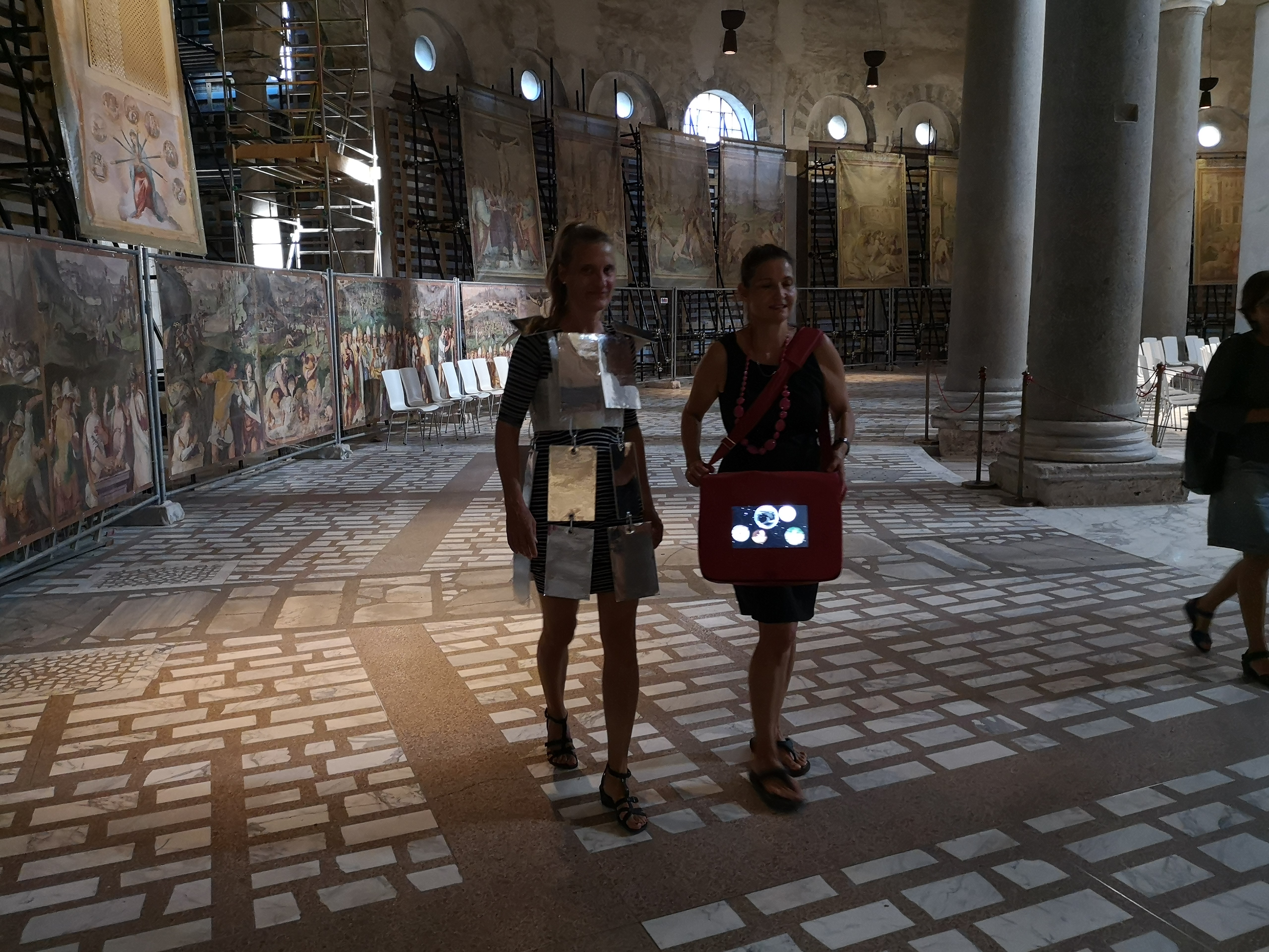 Our last meeting point was Santo Stefano Rotondo. The location was perfect for us because the original frescoes were replaced by digital duplicates which reflected in Phoebe’s mirrordress. We actually don’t see the original which we are eager to protect, but its duplicate is everywhere and the quality is questionable.