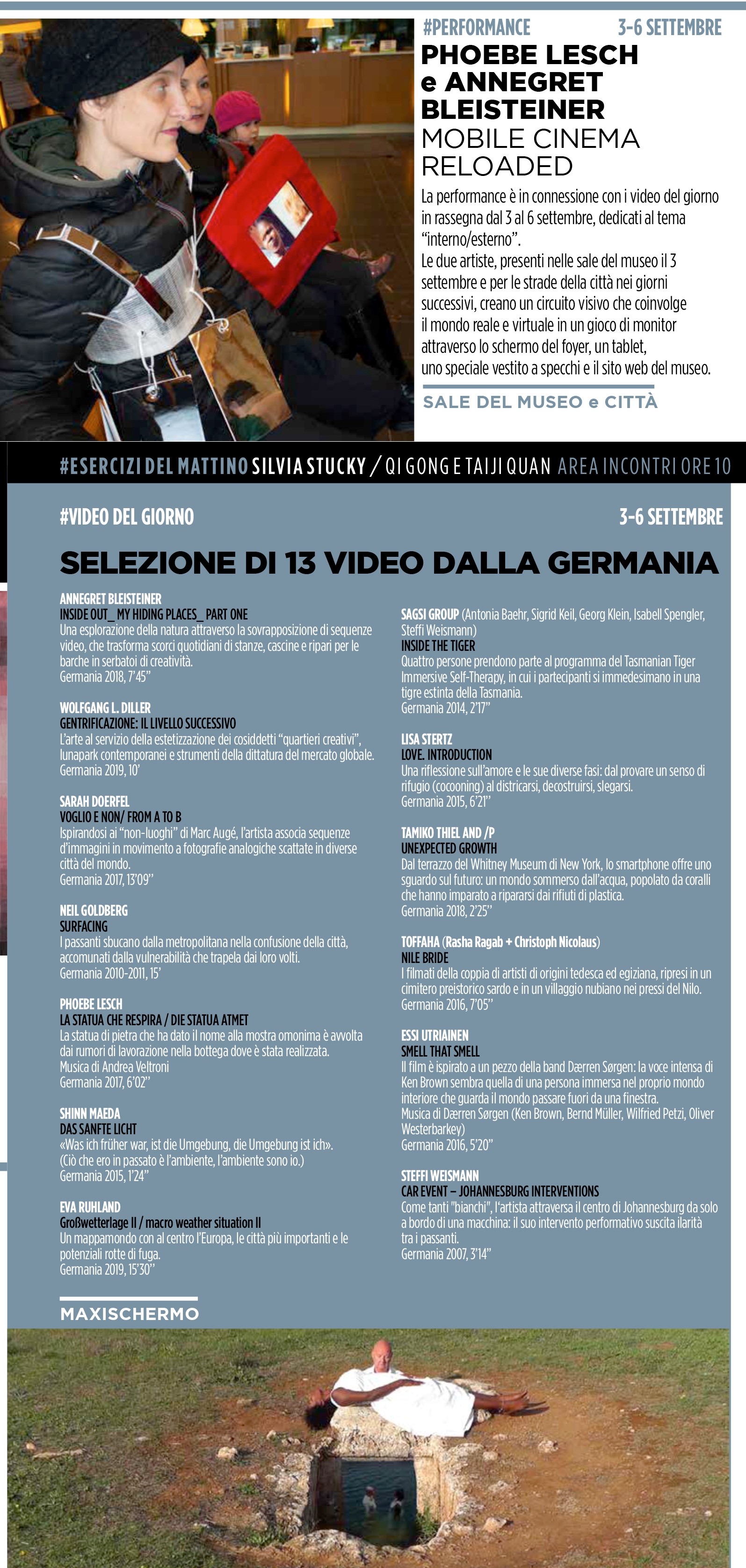 13 videos by Germany based artists dealing with "inside/outside" are shown in MACRO_asilo, Rome from September 3 through 8, 2019. As a performative act, they are also to be viewed a tablet carried in a special bag by Annegret Bleisteiner. The small screen is like a (Smartphone-)prothesis and has the same format as the streaming platforms where artists upload their videos nowadays.
